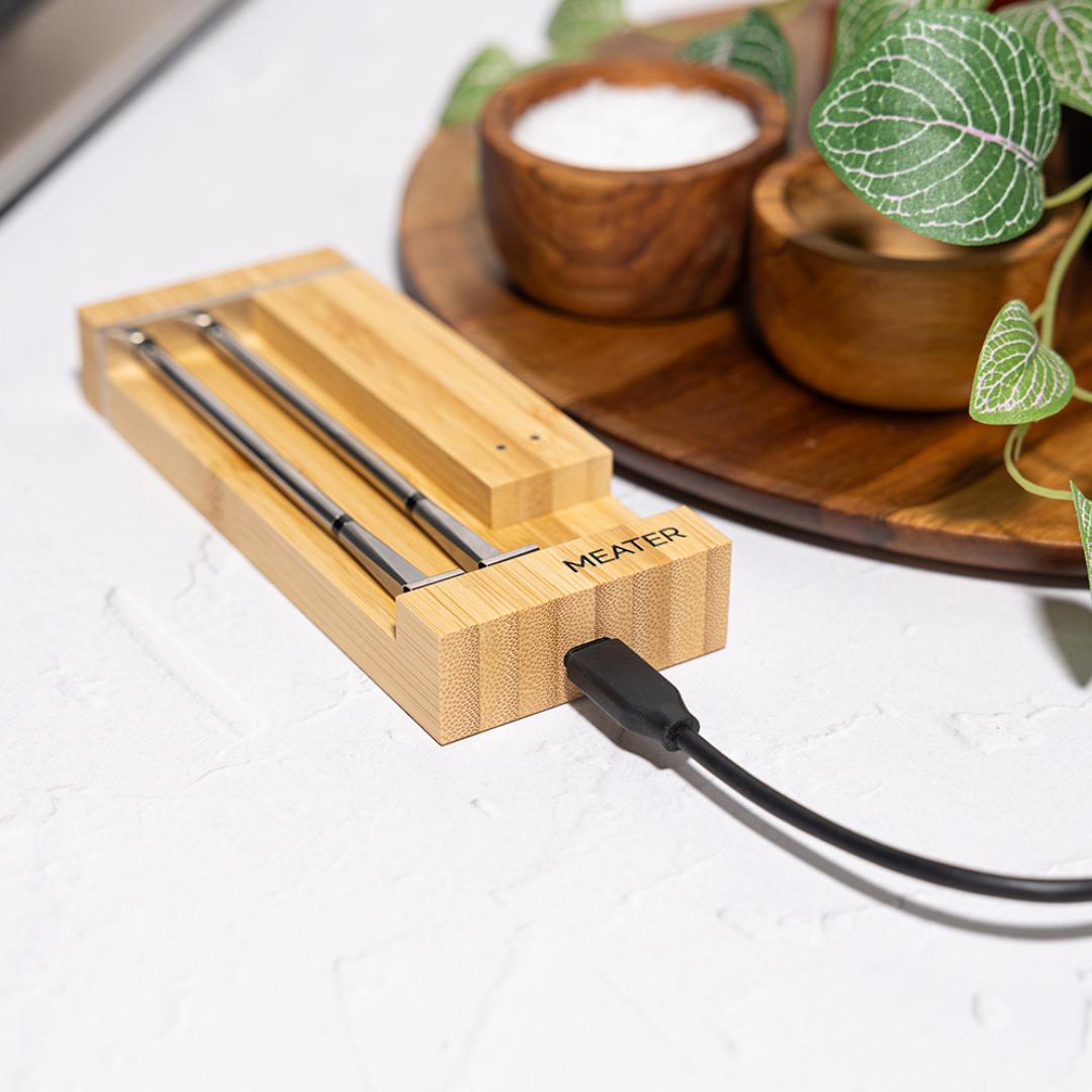 De probes laden automatisch op in het stijlvolle houten oplaadstation, dat tevens dient als Bluetooth- en WiFi-versterker. Zo blijft de verbinding stabiel terwijl jij ontspannen kunt genieten van je BBQ-sessie.